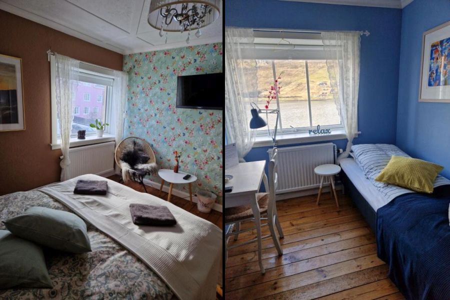 Knus guesthouse in het pittoreske vissersdorpje Sørvagur. De 3 kamers zijn gelegen op de bovenetage en hebben een TV en gratis wifi. Sommige kamers kijken uit op de zee of de bergen. 2 Gedeelde badkamers op de gang. Er is een gemeenschappelijke keuken, waar je zelf je ontbijt of maaltijden kan bereiden. Op de benedenetage is het sfeervolle, met veel curiosa ingerichte, Cafe Fjørdoy gevestigd, waar je ’s avonds kunt eten. Torshavn 48 km. 3 Km van de luchthaven Vagar. Vanuit Sørvagur vertrekt de ferry naar het vogeleiland Mykines. Vlakbij het fraaie Sørvagsvatn meer, dat op een hoge klif ligt, met de Bøsdalafossar waterval.